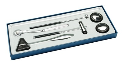 Additional babinski head included Additional 12"; handle for babinski hammer included Set comes complete in a blue 13"; x 1"; container